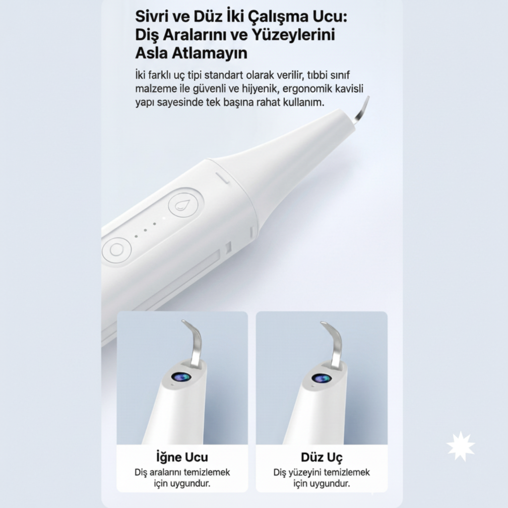 İki farklı medikal sınıf paslanmaz çelik uç içerir: "İğne Uç" ile diş aralarındaki, "Düz Uç" ile yüzeylerdeki inatçı lekeleri hedefleyin.